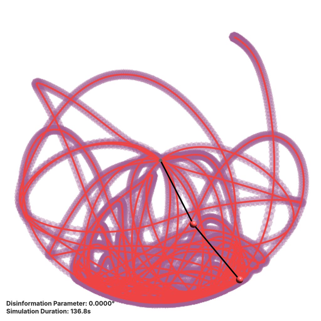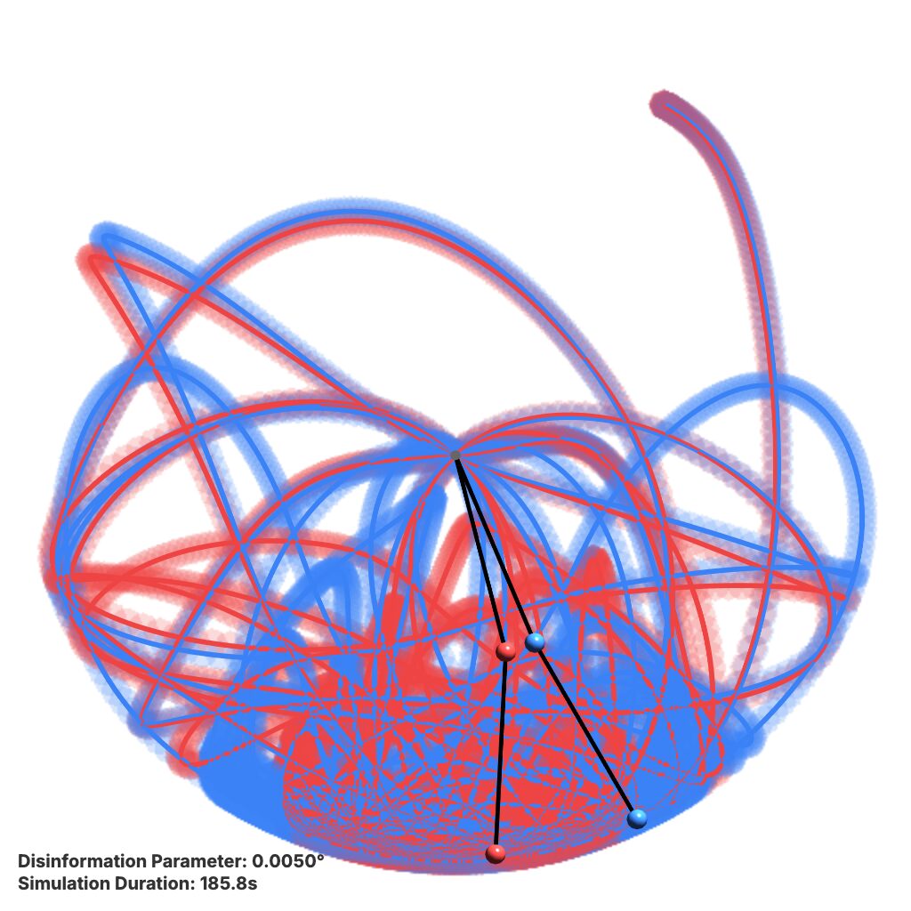 **Metaphor:** The two pendulums start almost identically (initial consensus), but a microscopic difference (the “disinformation” parameter) quickly pushes them into drastically different, chaotic paths (“parallel realities”). These paths gradually “color” the background, showing how frequented trajectories form distinct, persistent realities.