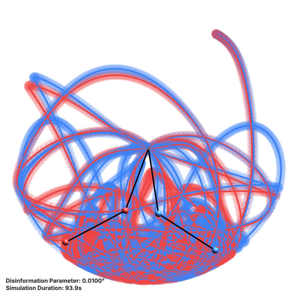 Check out this 3D simulation of two double pendulums. They start almost identically, but the small difference in the “Disinformation Parameter” (the tiny starting angle offset) ensures that their paths diverge rapidly into totally separate, chaotic motions, effectively demonstrating the concept of “bifurcation of reality” through “chaos dynamics.” Feel free to adjust the Disinformation Parameter slider and hit the “Start Simulation” button to see the effect!