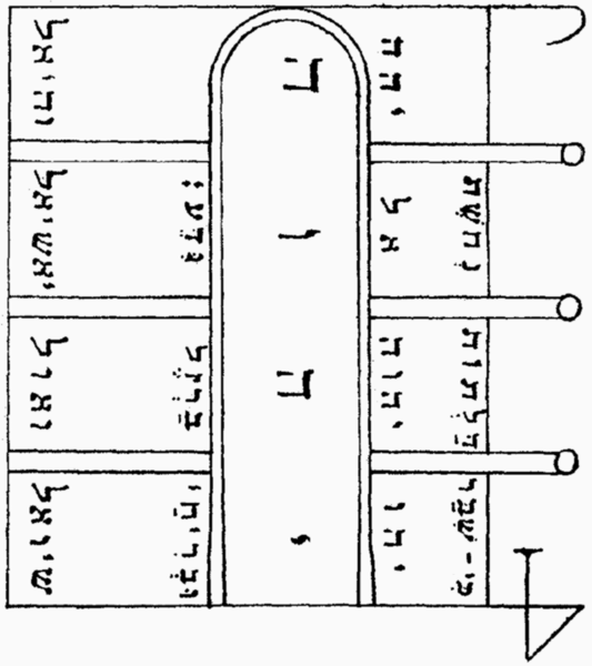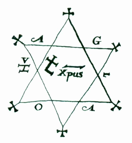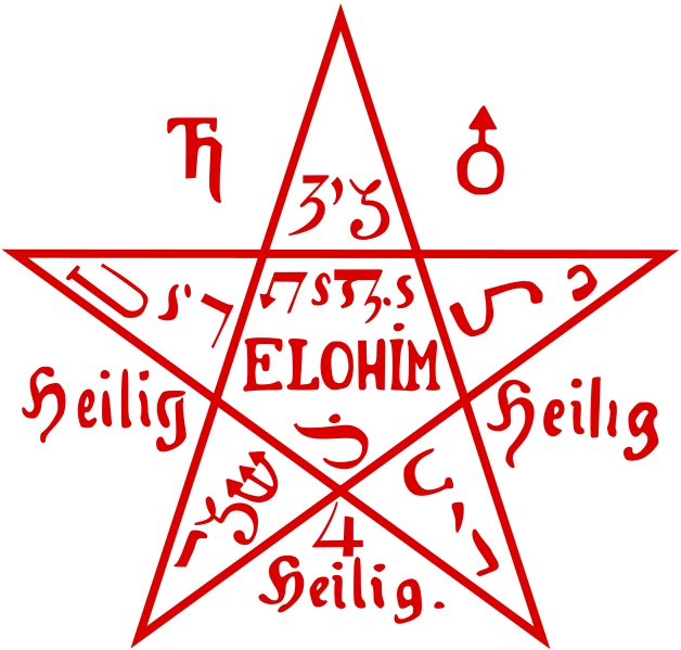 …it seems most likely that it comes through Italian and French from the root pend- “to hang,” and so is equivalent to a pendant or charm hung about the neck. From the fact that one form of pentacle was the pentagram or star-pentagon, the word itself has been connected with the Greek pente (five).[17]